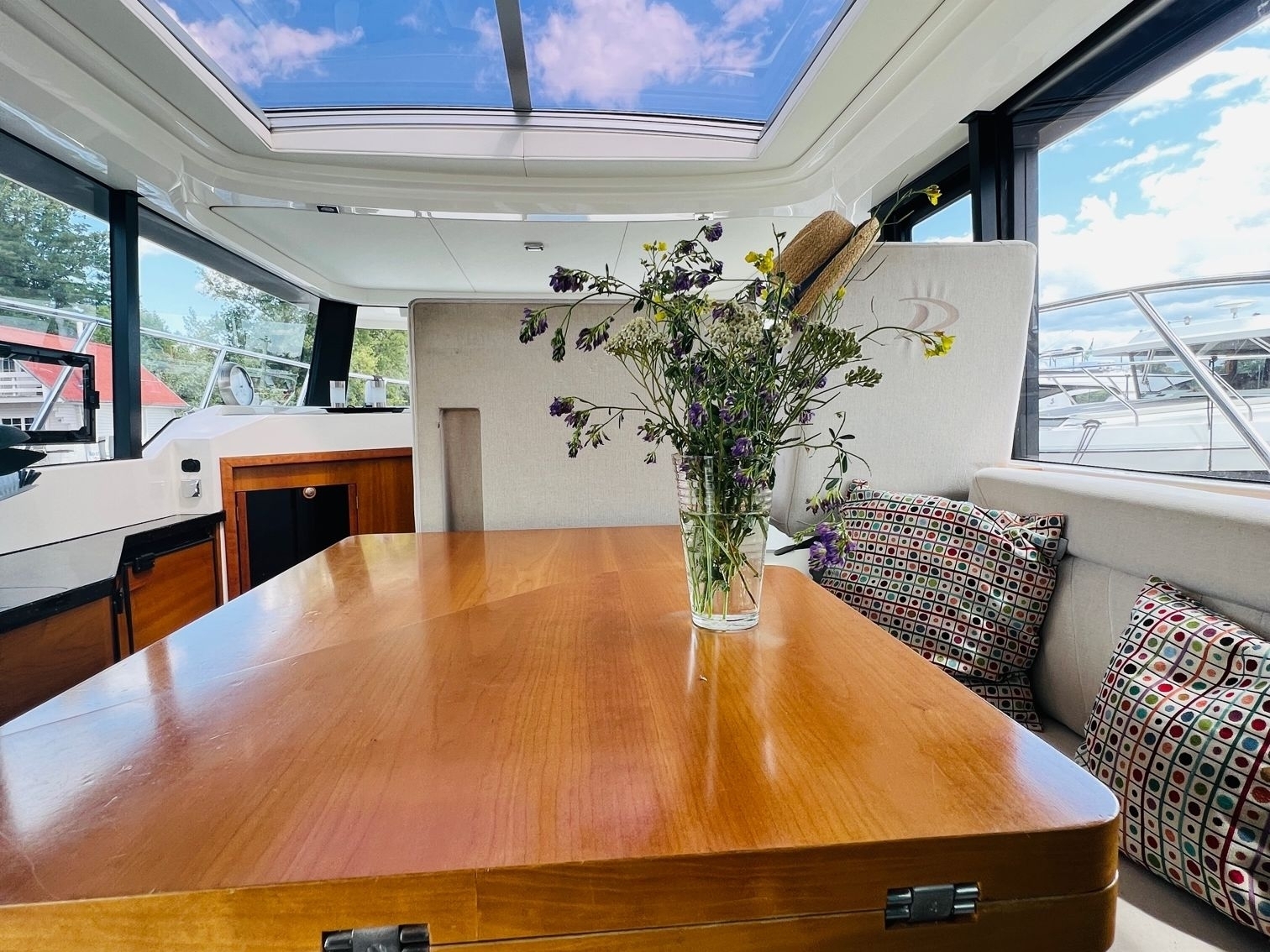 Das elektrische Glas-Panoramadach bringt Licht und Wohlfühlatmosphäre in den Salon. Die Pantry ist ausgestattet mit zwei Kühlschränken, einem Backofen und einem Gasherd mit zwei Flammen. Selbstverständlich ist alles was zum Kochen benötigt wird an Bord.