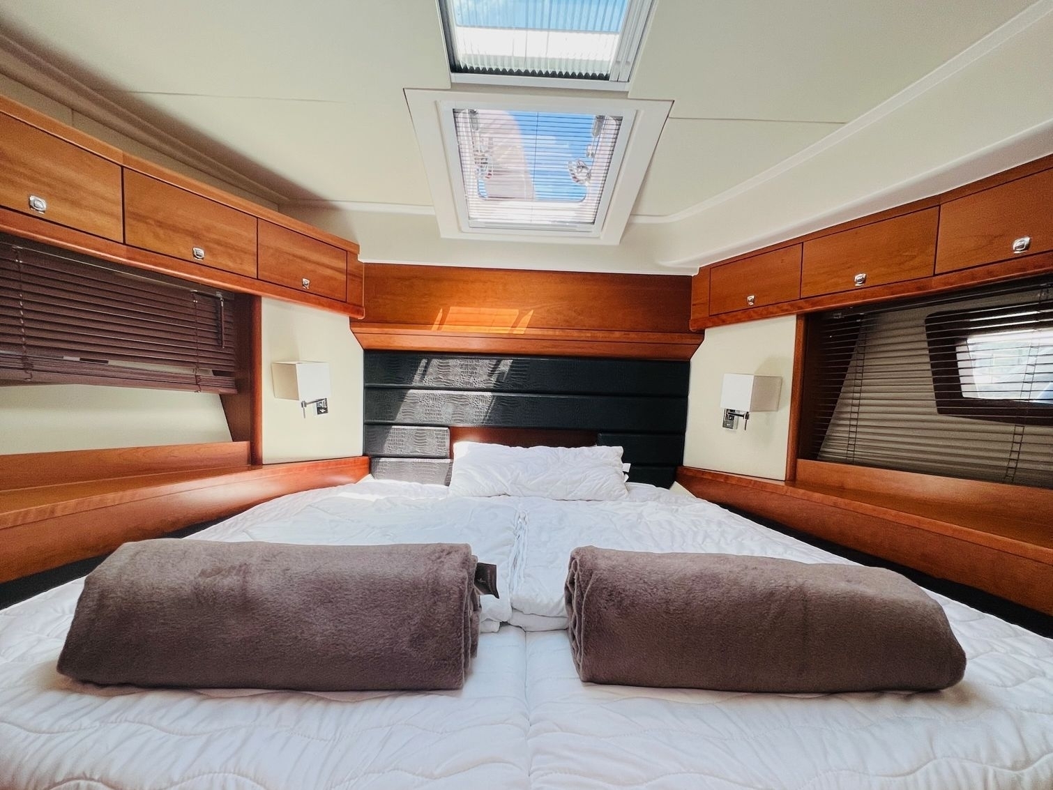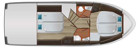 Die „Sophia“ verfügt über zwei bequeme Kabinen mit Doppelbetten, Schränken und Ablageflächen, sowie zwei Nasszellen mit elektrischen WCs und einer integrierten Dusche. Das Boot wird durch den kraftvollen und gleichzeitig sparsamen Dieselmotor mit 85 PS souverän angetrieben und bei Einparkmanövern ist es dank Bug- und Heckstrahlruder sehr einfach zu positionieren.