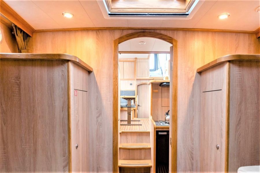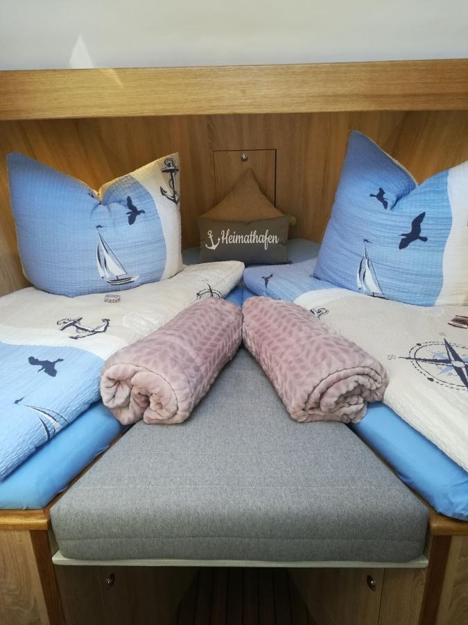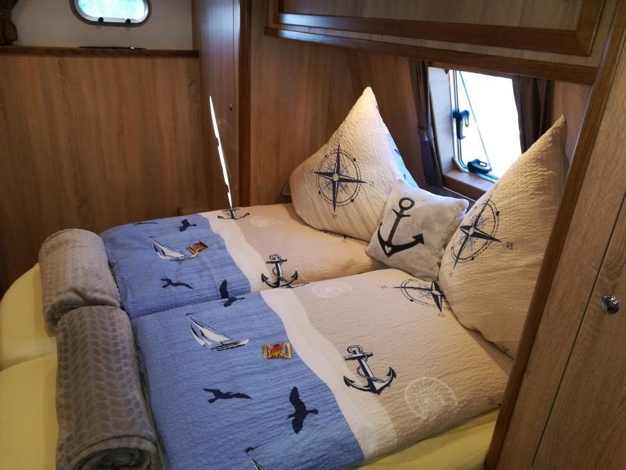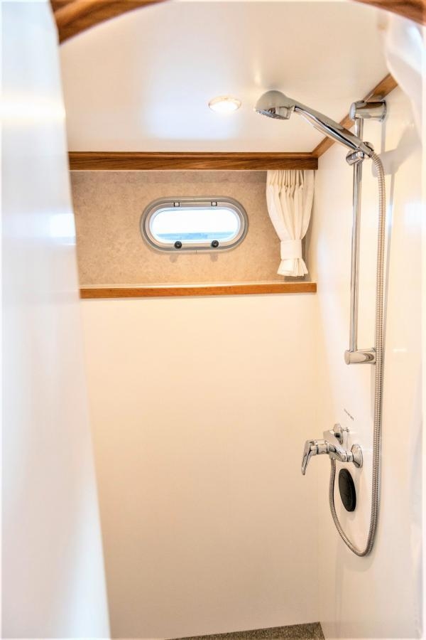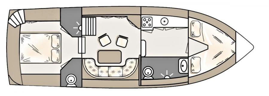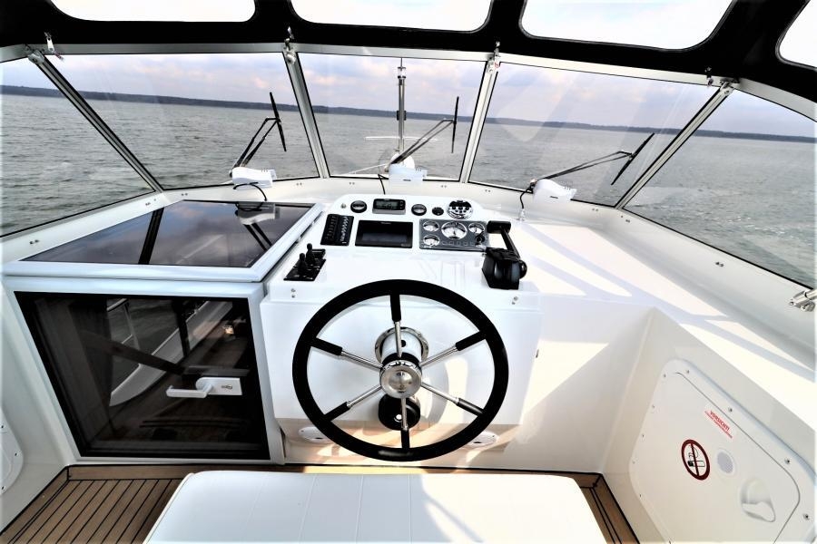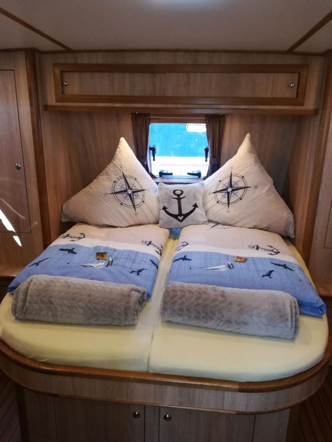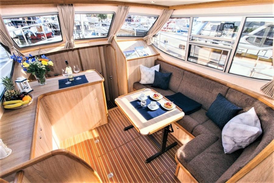 Auf das Achterdeck gelangt man leicht und sicher über eine beleuchtete Treppe, der beheizte Fahrstand bietet reichlich Platz für die Besatzung und lädt mit der U-Sitzgruppe zum entspannten Verweilen ein. Die komplett verschließbare Persenning reicht über das gesamte Achterdeck mit dem beheizten Fahrstand. Über einen breiten Niedergang gelangt man in den großzügigen Salon. Zwei Schlafkabinen mit bequemen Doppelbetten und zwei Bäder mit elektrischen WC´s (1x Bad mit WC und separater Dusche, 1 x Bad mit WC und integrierter Dusche) bieten Privatsphäre und sorgen für entspanntes und komfortables Wohnen an Bord.