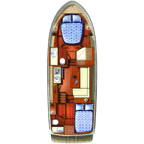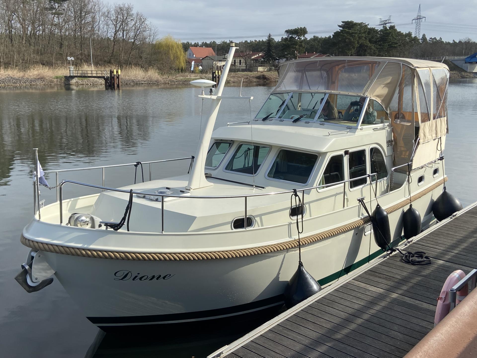 Außen besticht die „Dione“ durch ein breites Gangbord und eine Rundum-Reling. Die hochwertige und durchdachte Ausstattung, macht die „Dione“ zur idealen Motoryacht für 2 Personen, oder Familien mit bis zu 4 Personen.