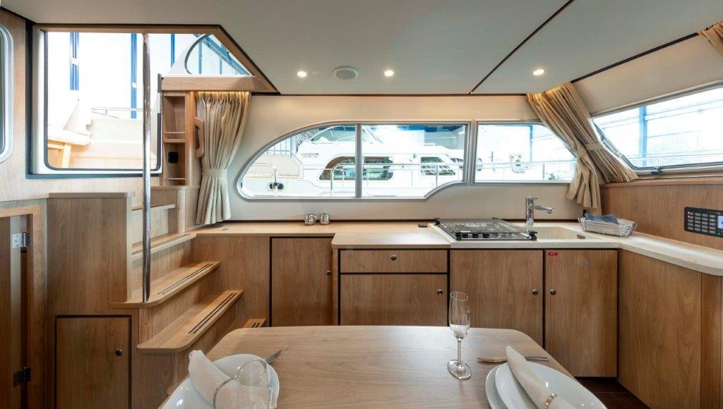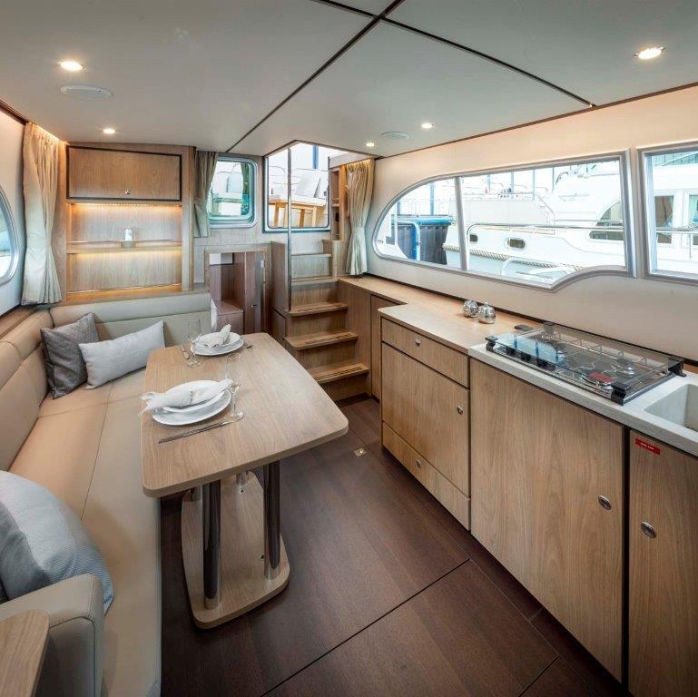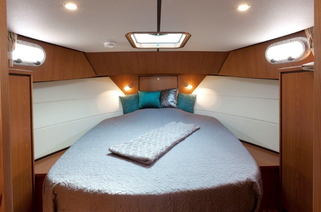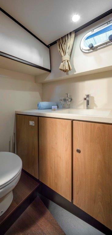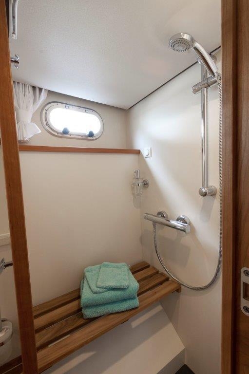 Die „Julia“ verfügt über zwei Kabinen mit komfortablen Doppelbetten, zwei Nasszellen mit Waschbecken und elektrischen WC´s, sowie einer Duschkabine. Das Boot bietet reichlich Stauraum für die Besatzung und eine komplett ausgestattete Küche.