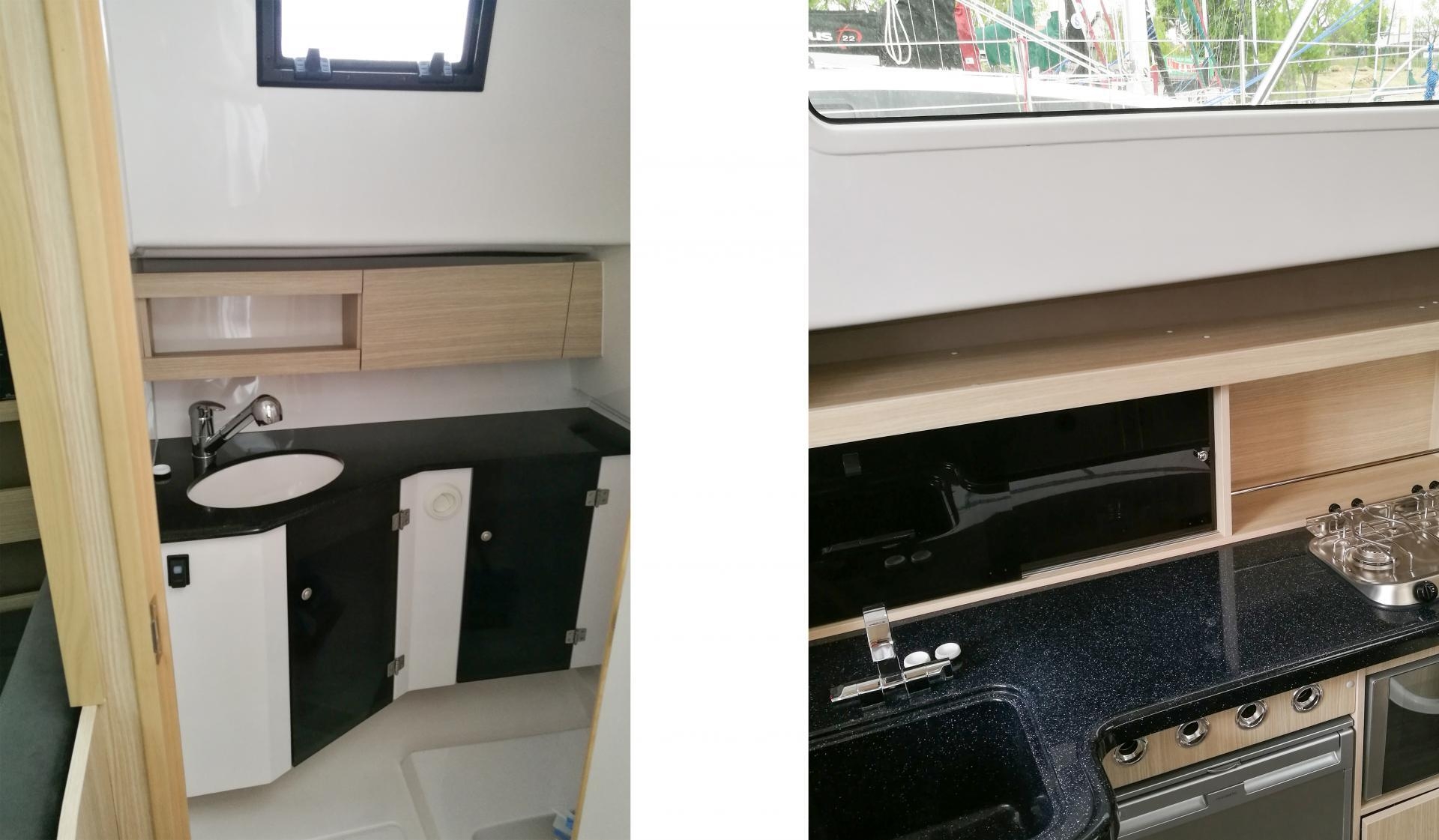 An Bord gelangen Sie von beiden Seiten, oder bequem von hinten über die Badeplattform. Der Fahrstand und die Sitzbank mit Tisch und Cockpit werden vom Hardtop überdacht, die Seiten sind bei Bedarf mit einer Persenning voll verschließbar. Über den Niedergang gelangen Sie in den Salon mit voll ausgestatteten Küchenzeile. Die „Elektra“ verfügt über eine Nasszelle mit Duschfunktion und einem elektrischem WC. In der Bugkabine finden 2 Personen Platz, in der Schlupfkoje können weitere 2 Personen übernachten.