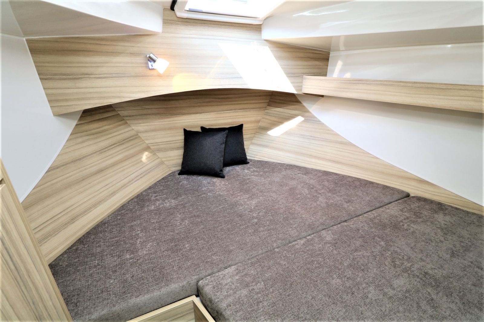 Über eine 4 stufige Treppe gelangt man in den Salon mit U-Sitzbank. An Backbord befindet sie die Nasszelle mit integrierter Dusche und elektrischem WC. Die vollausgestattete Pantry mit Granit Arbeitsplatte lässt keine Wünsche offen. Ein weiteres Highlight sind die 3 Kabinen. Das Bett in der Vorderkabine hat eine Liegefläche von ca. 1,50 m x 2,00 m, die Betten in den Achterkabinen haben eine Liegefläche von ca. 1,20 m x 1,95 m und bieten theoretisch 6 Personen Schlafplatz. Wir empfehlen das Boot aber auf Grund der kompakten Maße mit nur max. 4 Personen zu belegen.
